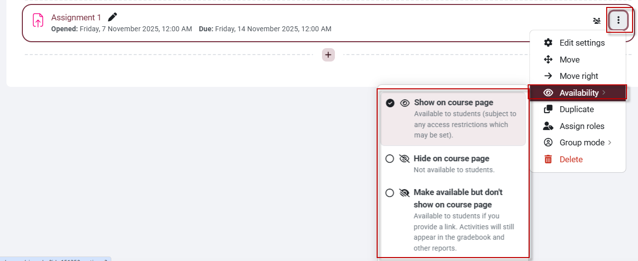 2. Find the activity, Click the three vertical dots and Click availability. From here you can select one of the three following options: