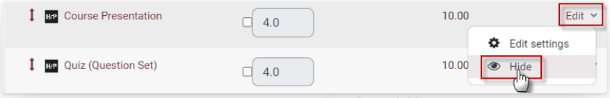 3. Find the activity that you want to hide, click Edit on the right and click Hide.
