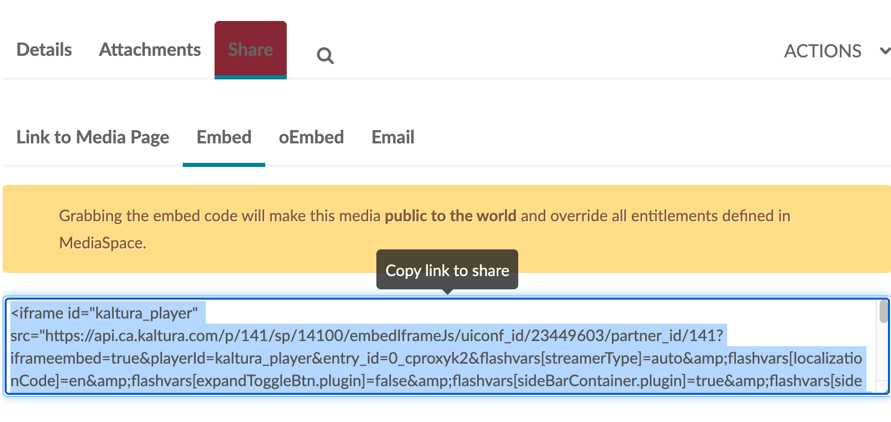 3. Go to media.kpu.ca and select the video that you want to embed. Then click Share and copy the embed code.
