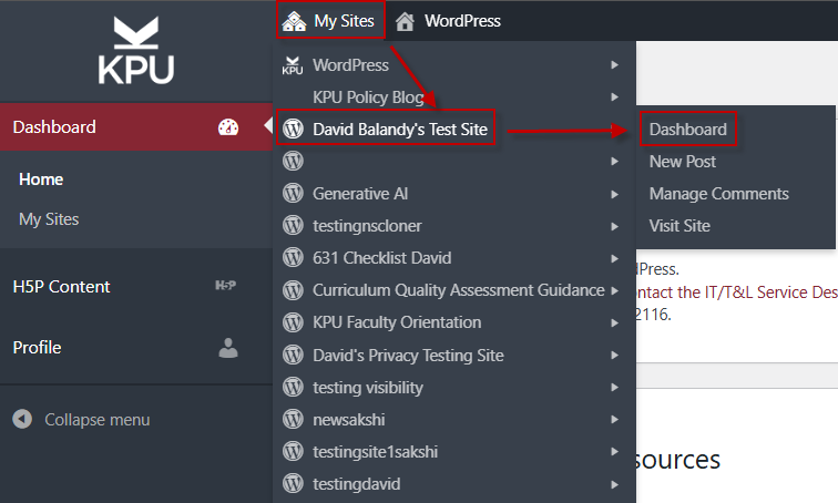 2. Click on My Sites in the upper left, then hover over one of your sites and click Dashboard.