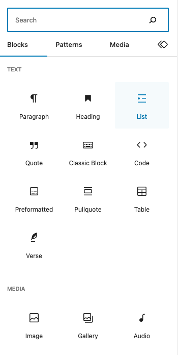 Ease of use is the focus for patterns. As the name states, patterns provide a template of layouts that could be used in your content. The number of patterns available is dependent on the theme selected. Selected patterns are then added as blocks which can then be customized to match the appearance of your site.