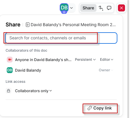 4. To share the Doc outside of the meeting, click Share from the top right corner of the Doc. You can search for contacts or copy link.